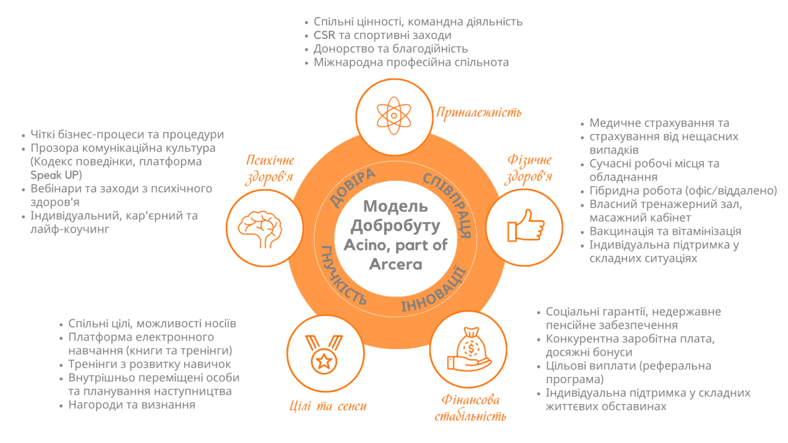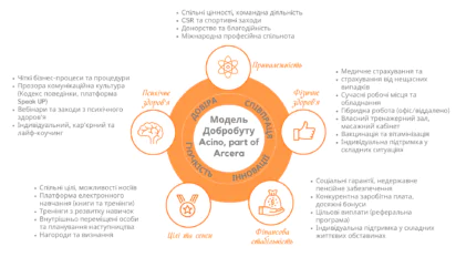 В компанії діє Модель Добробуту, яка базується на корпоративних цінностях, забезпечує прості і зрозумілі бізнес-процеси та ефективну взаємодію. Піклуючись про ментальне та фізичне здоров’я своїх співробітників, компанія підключає їх до недержавних програм медичного та пенсійного страхування, проводить вебінари та тренінги з провідними спеціалістами різних галузей. На території заводу побудований власний сучасно оснащений спортивно-навчальний комплекс, який пропонує працівникам різноманітні оздоровчі програми. Корпоративні та благодійні заходи дають можливість кожному відчути справжню підтримку колег та долучитись до соціальних проєктів та ініціатив. Компанія Acino пильно відстежує зміни в умовах праці на ринку та забезпечує достойну заробітну плату, мотивуючі бонуси і має прозору систему цільових виплат.